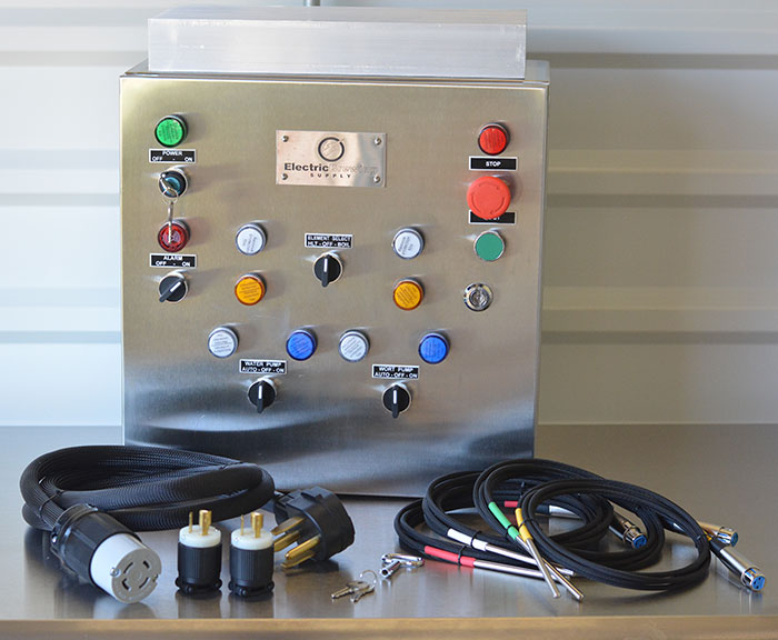 - Hit the ground running with one of our complete control panels. Save your time and energy, and let Electric Brewing Supply help you get a jump on your electric brewery. Include your wireless network information with your order, and we'll configure the brewery to connect for you. Due to the custom nature of these, delivery will varyAlways subject to prior orders. Average lead is approx 4-6 weeks, during busier seasons this can stretch to 8. Now available in 220v variants for Europe and Australia Hit the ground running with one of our complete control panels. Save your time and energy, and let Electric Brewing Supply help you get a jump on your electric brewery. Electric Brewing Supply does the work so you don't have to. Featuring a fully configured 30a Control panel, ready to be mounted on the wall and plugged in. Design features independent control of pumps, either by BCS controller or manually. Elements are controlled only by BCS, with a selector switch controlling which element is controlled, for added safety. Have a problem? Wort pumping all over the floor? Forgot a hose? The red mushroom stop button halts all functions, without cutting your brew day short. Specifications: 30a, 240v electric, single phase (for safety, please use GFCI protection) 30a Twist lock power in supply to plain wire end or 4 prong washer/dryer plug, 6 ft wire Embedded Control Concepts BCS-460 installed (some basic configuration available) 2 L6-30 Flanged outlets for 240v Elements upto 5500w , plugs included with panel* 2 L5-15 Flanged outlets for 120v for pumps such as Chugger or March, plugs included with panel 4 temperature probe outlets, Cat5 style, for easy connection 4 4" long temperature probes with Stainless steel 1/4" to 1/2" NPT compression fitting 1 Cat5e Network adapter connection to communicate with network (wireless client available) Key style power switch for secure storage Locking mushroom button stops all power to elements and pumps What will you need aside from the panel to get going: 4500w or 5500w element in protective enclosure to attach to kettle Available here 30a GFCI protected, single phase 240v electric service to brew area. Electrician installed highly recommended. 1-2 Pumps with plugs changed to twist locking L5-15 plug. Plugs are provided in package Kettles to your liking More on BCS Web-based User Interface The BCS series' user interface is all web based. Monitor and control temperatures and processes on your browser from any computer (or smartphone) anywhere. Check out some Screenshots. Temperature Sensor Inputs The BCS-460 allows up to four independent temperature sensors to be monitored simultaneously. Inputs can be any NTC thermistor based sensor with a 10Kohm ambient reading. Use our sensors, or purchase/build your own. Just set the temperature coefficients that are provided by the sensor manufacturer into the BCS-460, or calculate them based on experimental data. Inputs / Outputs Along with the four temperature sensor inputs, the BCS-460 provides four 5V discrete inputs, and four web-based user inputs. All inputs can trigger controller responses. Six low-current 5V discrete outputs are provided for relay control. Each output can be set to be controlled directly, differentially by a temperature input, or under complete PID control. Affordable expansion cards are available to increase the number of digital inputs and outputs. The Digi16 expansion card adds 12 outputs and 4 inputs. The interface supports upto 4 Digi16 expansion cards, for a total of 54 outputs and 20 inputs! Advanced Data Logging Data is logged internally in the device, and displayed on your browser, or saved as a text file. The BCS-460 supports internal logging of four signals up to 4k samples each. The user can set the frequency of the samples anywhere from 1 second to 6 hours, resulting in trace lengths anywhere from 1.1 hours to 2.8 years long. Programmable Processes A revolutionary State Machine interface allows the user to program with simple and intuitive rules, giving the controller the ability to exhibit extremely complex behavior. The BCS-460 allows up to eight independent processes, each with eight states. Check out the documentation for programming examples. Open Interface API The control system from ECC utilizes a simple HTTP GET/POST mechanism to control and monitor the unit. The protocol is completely open and documented, allowing users the ability to develop third-party interfaces. Does your application require a unique GUI, or if would like to have your own data logging/graphing application? Want to link multiple BCS systems together and have them all controlled from a unified interface? The possibilities are endless. Check out our Forum to see what the community is offering. Questions? See our Frequently Asked Questions, post in the forum, or contact us directly. http://www.embeddedcc.com/wiki/index.php?title=FAQ http://forum.embeddedcc.com/ http://www.embeddedcc.com/index.php/contacts This product is intended for experimental home use only. No warranty or guarantee of suitability (express or implied) is given for commercial use of this product. Product warranties may be revoked if it is determined that product faults are due to misuse, abuse, or improper connection. Buyer agrees that Electric Brewing Supply, LLC shall not be liable for either specific performance or any liability, loss, tampering, abuse, damage, including consequential and incidental damages, arising out of buyer's purchase of the equipment, or any defects in the equipment.