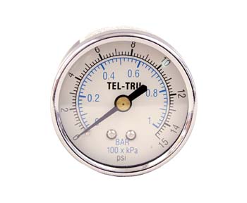1/4" Back Mounted Thread, 0-15 lb Dial Range. ,Please Note: Color/ style of gauge may vary