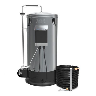 The Grainfather is an all in one Brewing System with a hefty feature set and an economical price tag. It has a small footprint, but will brew five gallons of beer from all grain using household 120 v power. Mashing takes place in the inner Stainless basket, and recirculates through the perforated plate (also SS!), resulting in great efficiency and clarity. This unit also includes a counterflow chiller for cooling wort post boil.