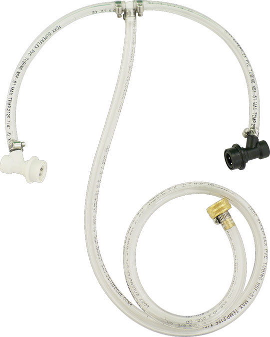 An inexpensive, time-saving assembly for rinsing out your Ball Lock kegs.,You've just finished a keg of your homebrew. Most of us set that keg aside and clean it later when we brew up the next batch. As it sits it gets harder to clean and then we definitely have to disassemble the entire keg to scrub all the parts.  Well for years our Metal Shop Manager and lead Product Designer, Darren Schleth, has been using a simple keg cleaner in our R&D brewery to rinse his kegs, while upside down, through the body connects.  The keg is instantly rinsed while all the residue is still soft.  The keg can then later be soaked with PBW and/or sanitized without having to remove the body connects or poppets.  This saves lots of time. As employees at MoreBeer! saw this simple assembly everybody wanted one of their own. ,To use: Connect the brass garden hose attachment to a garden hose. Then connect the grey and black quick disconnects to the inlet and outlet body connects on your Ball Lock keg.  Remove the lid and  turn the keg upside down. Turn on the water. Water risnes through both the inlet and outlet dip tubes completely rinsing the inside of the keg.,